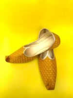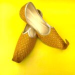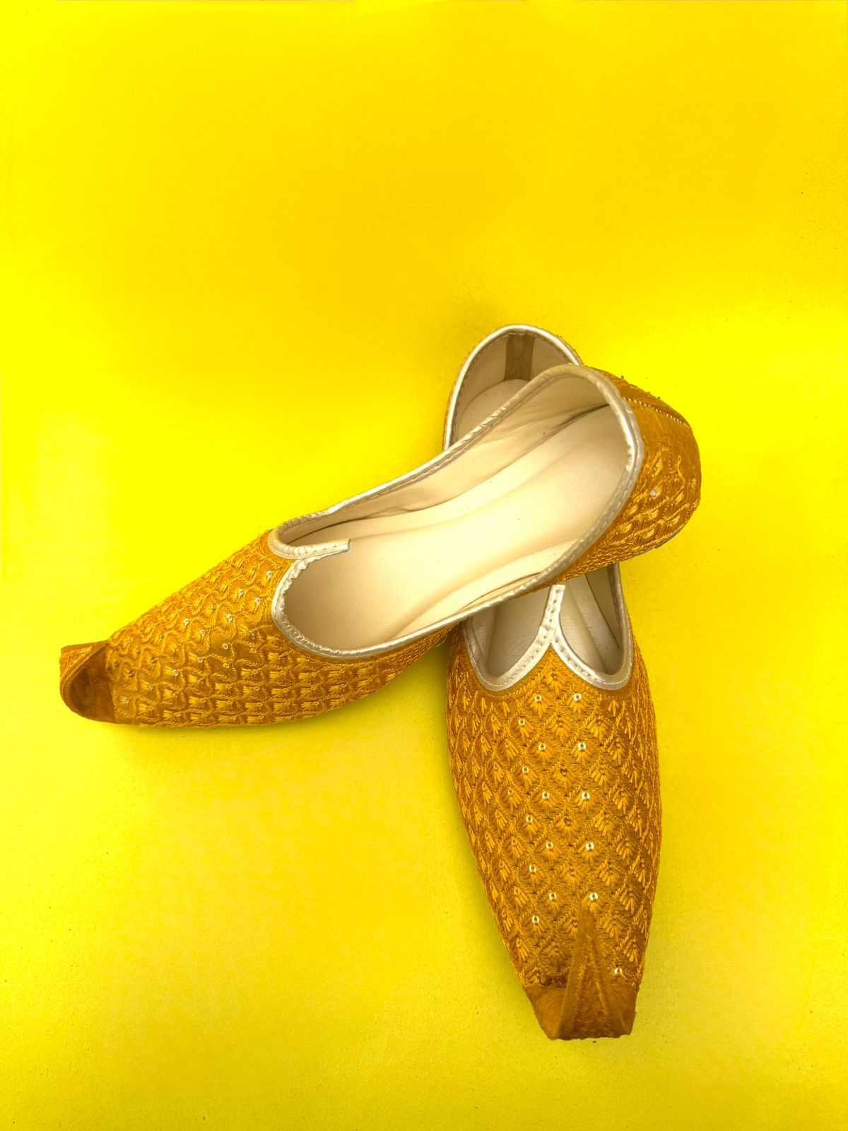 • Golden Yellow Khussa with thread work and shiny sequins.